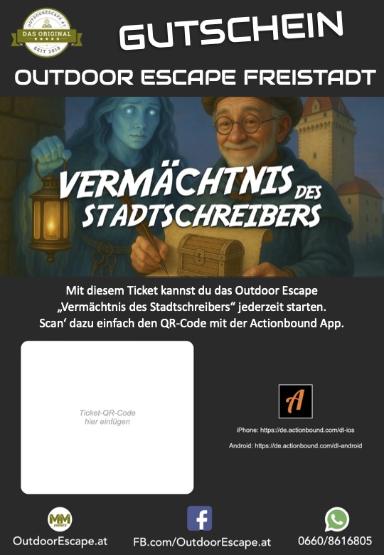 Das Outdoor Escape Vermächtnis des Stadtschreibers in Freistadt eignet sich perfekt für Familien. Mit einem Ticket kann die ganze Familie spielen. Kinder können gerne auch Freunde mitbringen. Das Spiel ist daher auch das perfekte Programm Highlight jeder Geburtstagsfeier! Kontaktiert uns gerne, falls ihr Fragen zur Organisation der Geburtstagsparty habt. Mit dem Ticket könnt ihr jedenfalls jederzeit starten, völlig unabhängig von einem fixen Termin oder Zeitpunkt. Das Ticket kommt nach der Bestellung unmittelbar per E-Mail an die angegebene Adresse. Entdecken, Rätseln und Spielspaß für die ganze Familie ist garantiert! Entdeckt Freistadt auf eine ganz neue Art und Weise.